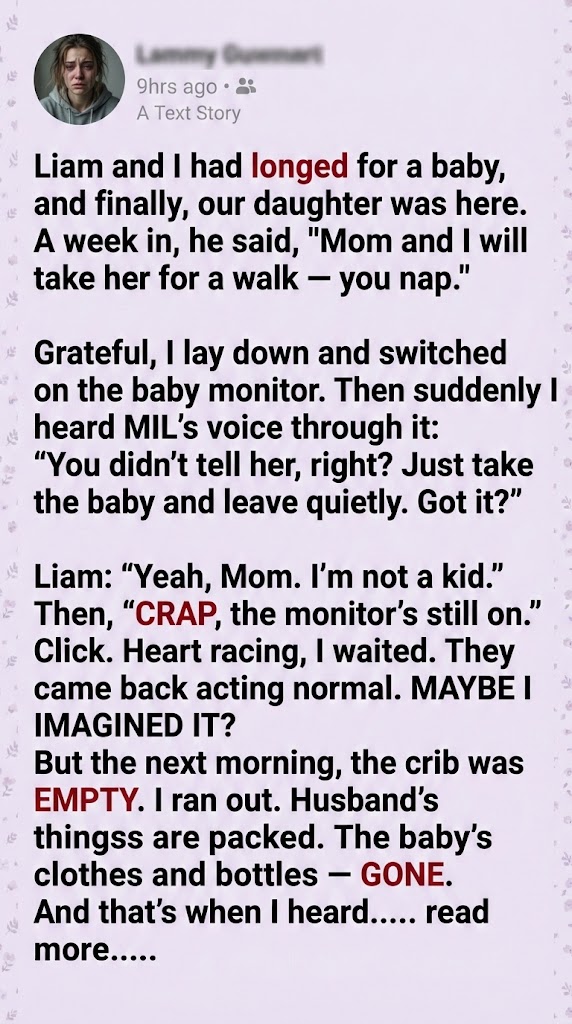 When Suzanne’s husband offered to take their newborn for a walk with his visiting mother, she thought he was just giving her a break. But minutes later, a conversation she was never meant to hear crackled through the baby monitor, and what she overheard shattered her trust.