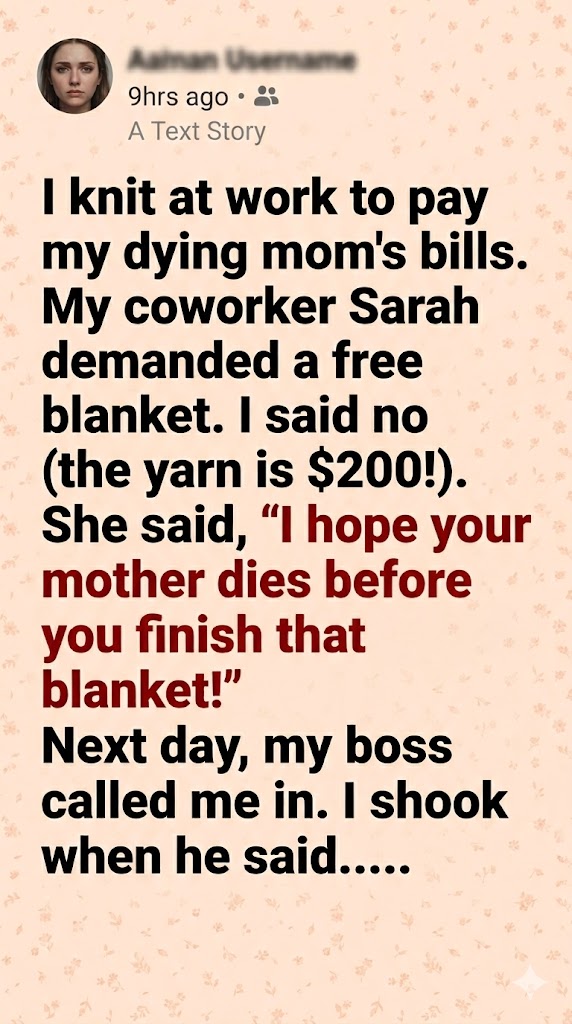 Three weeks later, I sat by my mother’s hospital bed. Her breathing was shallow, but her eyes were bright and focused as I draped the finished, incredibly soft blanket over her frail shoulders. She ran her fingers over the intricate stitches, a weak but genuine smile spreading across her face. She didn’t die before I finished it. In fact, wrapped in the warmth of that blanket, she finally looked like she was ready to fight.