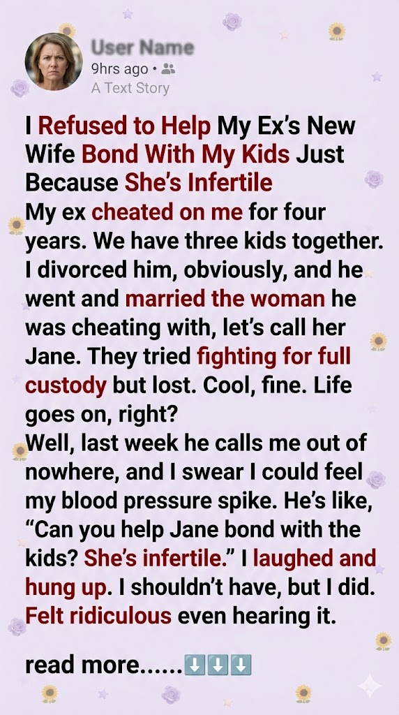 I called my ex back, completely furious. He admitted immediately that it was Jane pushing this. She was trying to “bond” with the kids and get closer to them. I lost it on the phone. I told them both, very clearly, to leave us alone. I made it extremely plain that her emotional state and personal issues regarding fertility were not my problem, and they certainly were not my children’s responsibility.