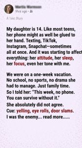 We were on a one-week vacation. No school, no sports, no drama she had to manage. Just family time. So I told her: ‘This week, no phone. You can survive without it.’
