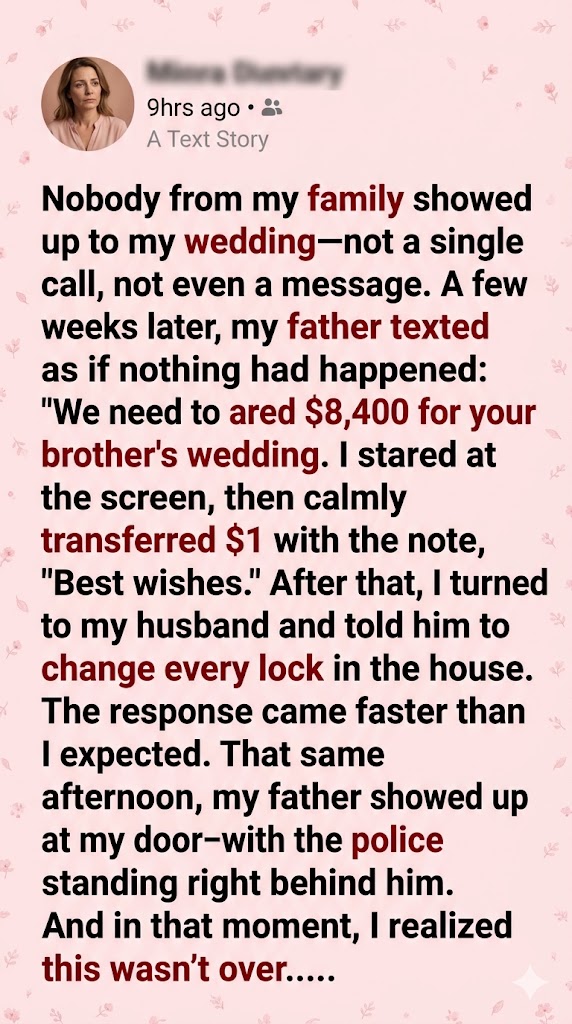 The officer frowned, taking the phone. He read my father’s original message aloud: “We need to raise $8,400 for your brother’s wedding. Send it by Friday.”