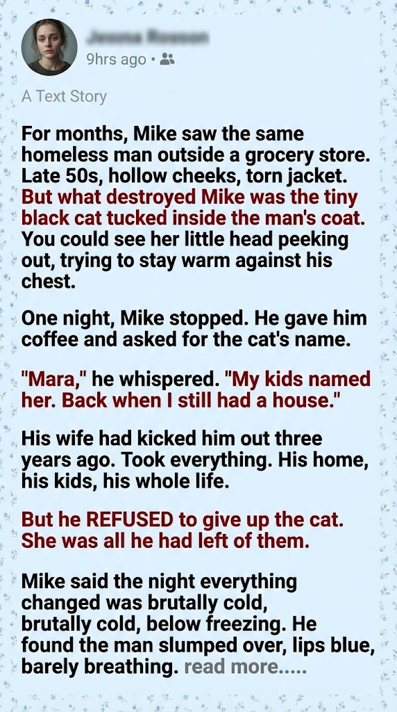 A man, Mike, walked past, but then, for some reason, he turned around. He bought a hot coffee and walked back, ignoring the rules of the invisible world. He simply asked, “Hey. Does she have a name?” I managed to rasp, my voice cracking, “Mara. My kids named her. Long time ago.” That single line—the mention of my children—it cracked something wide open inside me. Mike didn’t plan to get involved, but after that first night, he started showing up on purpose. He brought me sandwiches, gloves, and once, tuna just for Mara. I told him he didn’t have to do it, but he always replied, “I know. But I want to.”