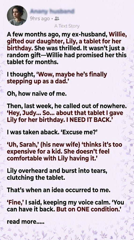 Just when I thought I’d found footing, Willie swooped in with a request so selfish I almost laughed. He called, casual as if discussing the weather. “Hey, Judy. About that tablet I gave Lily for her birthday…” My stomach tightened. “What about it?” Pause. That manipulative pause I knew too well. “I need it back.”