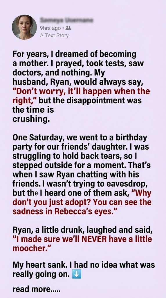 That’s when I saw Ryan with his friends, beer in hand, laughing. I wasn’t trying to listen, but I overheard one of them say, “Why don’t you just adopt? You can see the sadness in Rebecca’s eyes.”