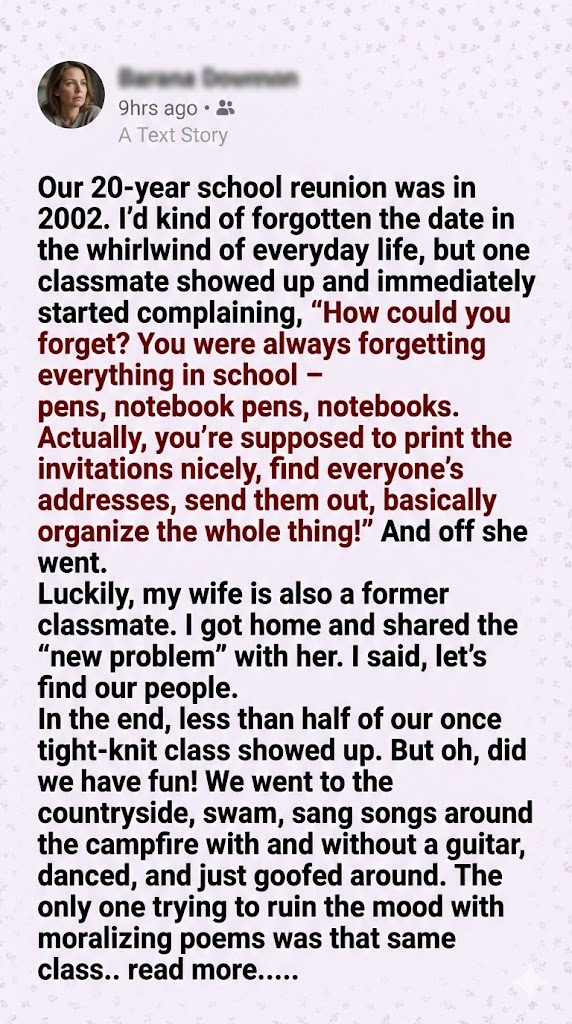 They headed to the countryside, where the real reunion began. They swam in the lake, sang around the campfire—sometimes with a guitar, sometimes without—danced barefoot in the grass, and laughed like teenagers again. The only person who didn’t quite fit the mood was the same classmate from earlier, reciting moralizing poems with a stiff posture and a serious face.