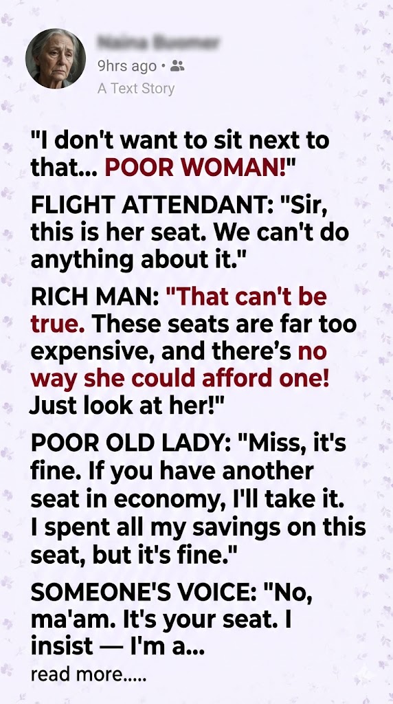 “Miss, it’s ok. If you have another seat in economy, I’ll stay there. I spent all my savings on this seat, but it’s better not to inconvenience others,” she said, placing her hand on the stewardess’ arm gently.
