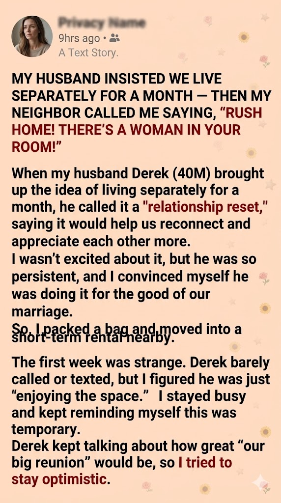 When Derek suggested we live apart for a month to “reignite our relationship,” I didn’t want to agree. It sounded like a ridiculous modern trend couples try when they are struggling but won’t just admit it. He made it sound like a grand plan, claiming the space would help us reconnect and truly appreciate each other, saying it would feel like we were dating all over again. I didn’t love the idea, but Derek was utterly insistent, and I knew fighting him would just make him lose his mind. So, reluctantly, I packed a bag, moved to a rental across town, and told myself that this temporary, forced separation would somehow be fine for the best.