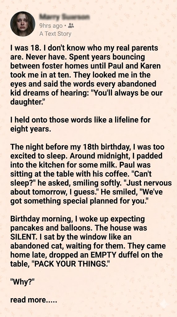 I woke up on the morning of my eighteenth birthday feeling a rare sense of excitement. For years, I had lived with the Gables, and though they were my foster parents, I had allowed myself to believe we were a real family. I expected, perhaps naively, a small celebration—maybe a cake or a few kind words about the man I was becoming. Instead, when I walked into the kitchen, I found my life packed into two weathered suitcases sitting by the back door.