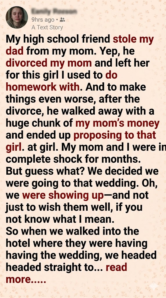 When my dad left my mom for my high school best friend, I thought the betrayal couldn’t get worse—until we got a wedding invite. We showed up dressed to impress, but we weren’t there to celebrate. We were there to expose everything.