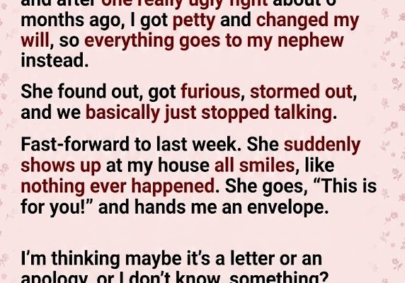 Fast-forward to last week. She suddenly shows up at my front door, all smiles, acting like nothing terrible had ever happened between us. She cheerfully says, “This is for you!” and hands me a thick, sealed envelope. I was thinking maybe it was an apology letter, or perhaps a peace offering? I didn’t know what to expect.