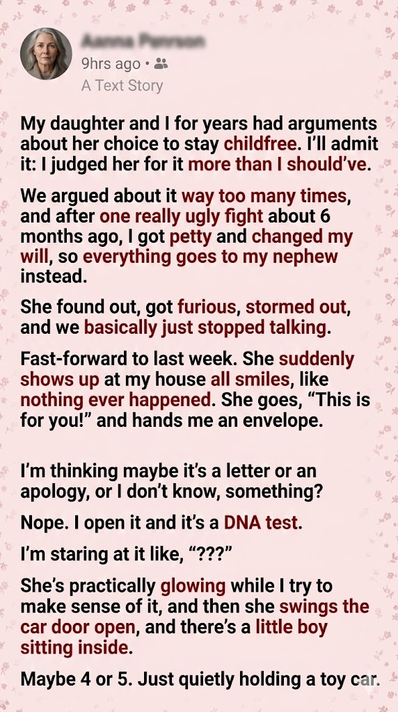 For context, my daughter and I have had arguments for years about her choice to stay childfree. I’ll freely admit it: I judged her for it far more than I truly should have. I wanted grandchildren. I felt she was being deliberately selfish. We argued about the decision way too many times, and after one particularly ugly fight about six months ago, I got petty. I retaliated by changing my will so that everything would eventually go to my nephew instead of her.
