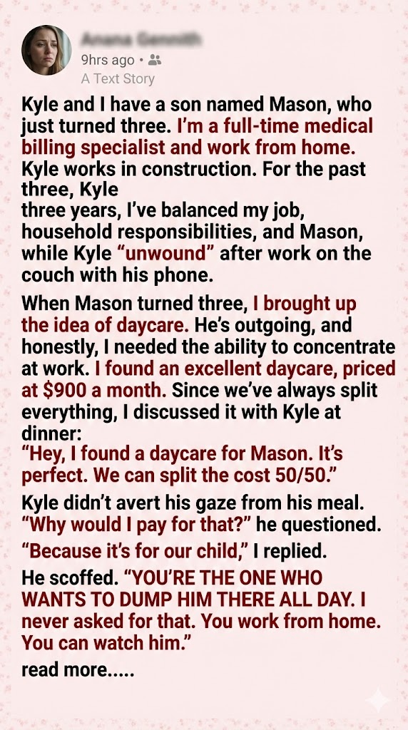 “How much?” Kyle asked, not looking up. “It’s $900,” I said. “And you want to split that?” Kyle asked, fork paused midair. “Yes. Like we split everything else.” “I didn’t ask for him to be in daycare, Nadia,” he said, shaking his head. “That’s your choice. You work from home. Why pay strangers when you’re right here?”