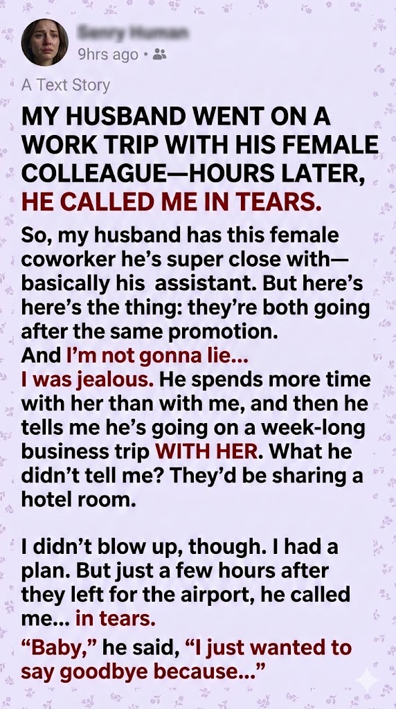 So, my husband has this female coworker he’s super close with, basically his assistant. But here’s the thing: they’re both going after the same promotion. And I’m not gonna lie… I was jealous. He spends more time with her than with me, and then he tells me he’s going on a week-long business trip WITH HER. What he didn’t tell me? They’d be sharing a hotel room. I didn’t blow up, though. I had a plan. But just a few hours after they left for the airport, he called me… in tears.