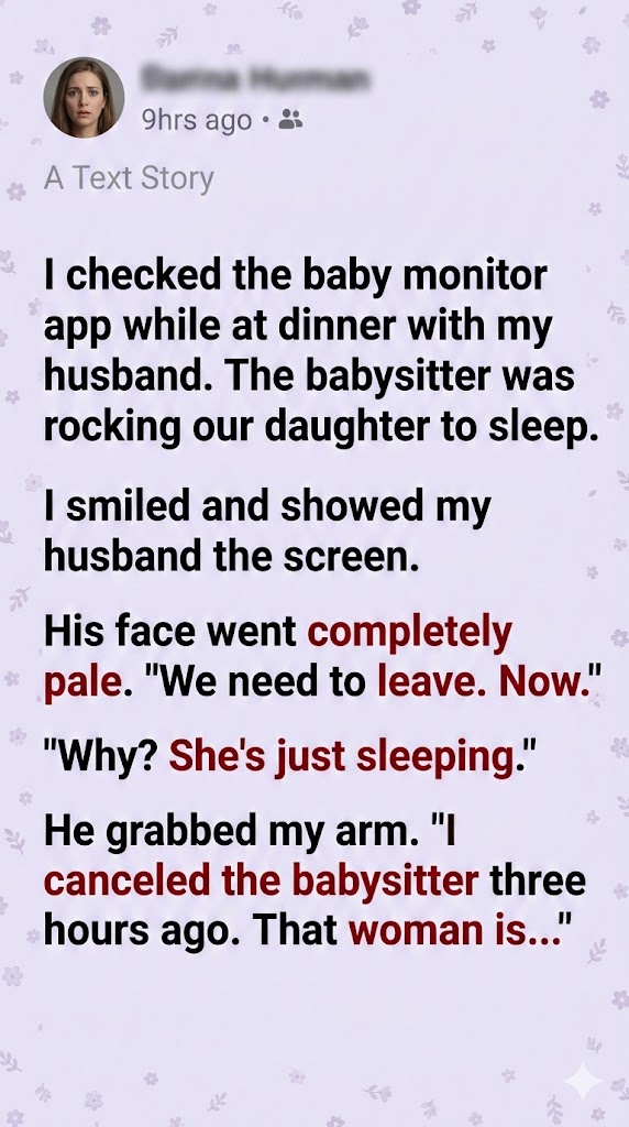 The clatter of silverware and the low hum of restaurant chatter vanished, replaced by a ringing in my ears. I stared at the phone in my cold hands. On the glowing screen, the woman continued to hum, gently swaying in the vintage rocking chair in our nursery. Her back was to the camera, her dark hair falling in long, stringy waves over her shoulders.