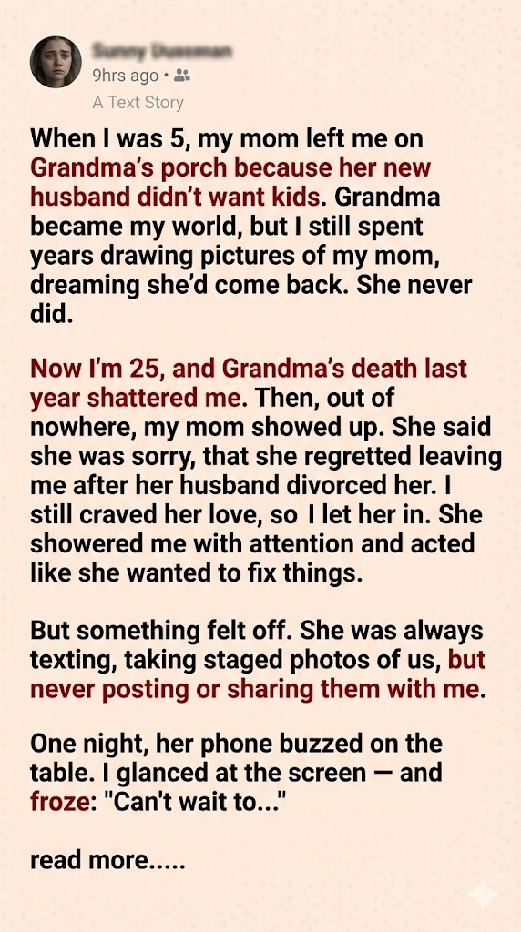 That porch became my anchor, the place I sat every afternoon waiting for a car that never came. I’d draw pictures of my mom—curly blonde hair, green eyes, always smiling. Sometimes I’d mail them, addressed in crayon to “Mom, California,” because I’d overheard once that she’d moved there. The letters always came back, marked Return to Sender. Still, I kept drawing. Some part of me clung to the idea that if I just loved her enough, she’d come back.