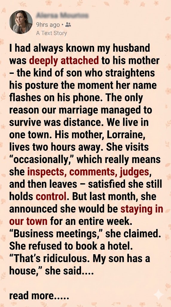 Lorraine had always been critical—pointing out dust, loose cabinet hinges, even mocking my clothes. Visits were short, thankfully. But then came the call: “I’ll be in town for a week. I’ll stay with you, of course.”