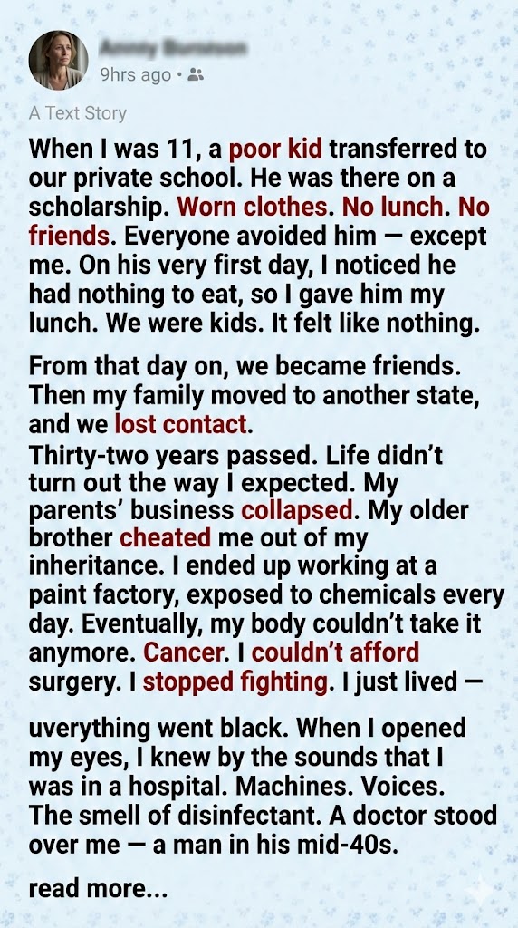 One morning, the lead oncologist walked in. He was wearing a surgical mask, but as he reviewed my chart, he paused. He looked at me for a long time before slowly lowering his mask. I froze. The face was older, but the eyes were the same.