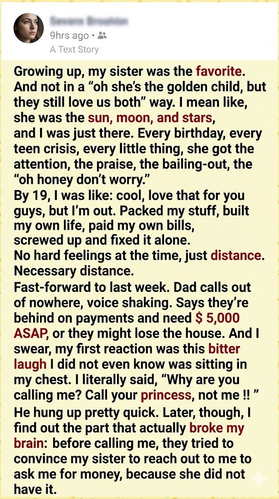 Later, though, I found out the part that truly broke my brain: before calling me, they first tried to convince my sister—their precious favorite—to reach out to me to ask me for the money, because she didn’t have the funds herself. Like… excuse me?