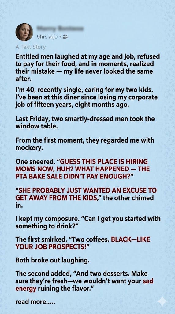 That afternoon, I walked out of the diner for the last time. The bullies didn’t just pay for their meal; they paid for my fresh start.