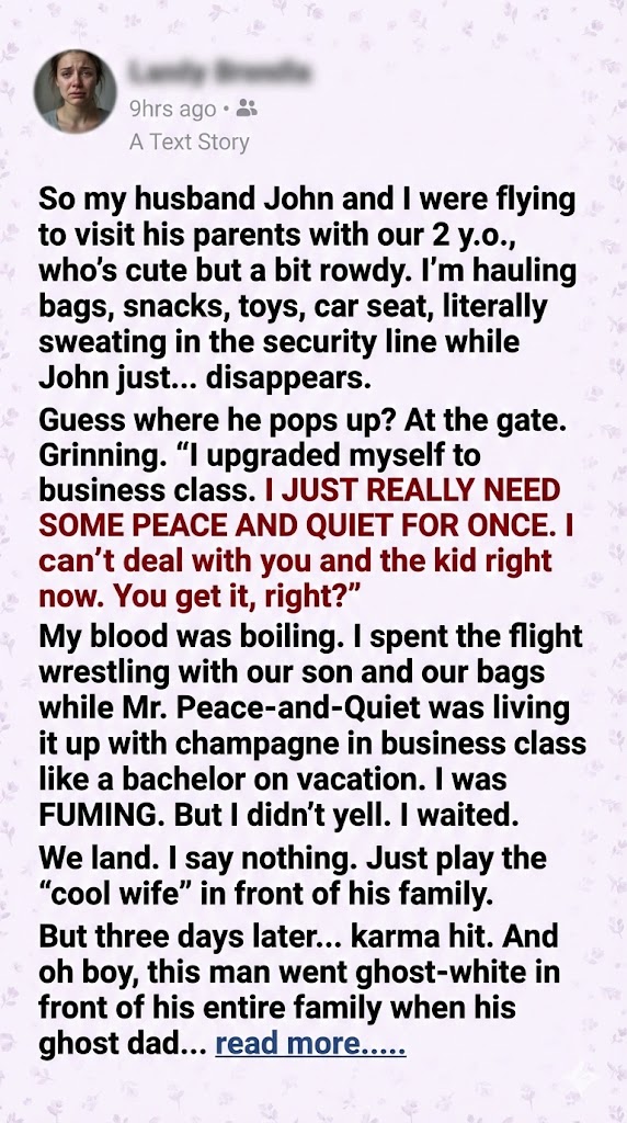 Claire thought she was heading into a peaceful family trip with her husband John and their toddler Ethan—but the moment they reached the airport, everything unraveled. While Claire juggled luggage and a restless child, John quietly upgraded himself to business class, leaving her alone in economy. His excuse? “I just need some peace and quiet.” That flight became a grueling test of Claire’s patience, while John sipped champagne in comfort.