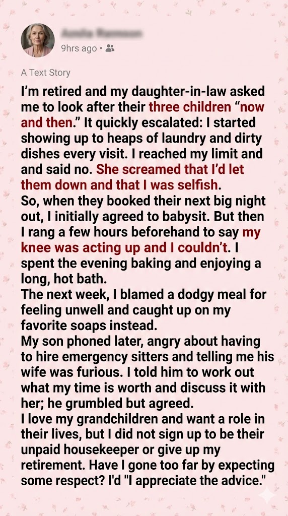 I love my grandchildren deeply, but I refuse to give up my much-needed retirement. Have I truly gone too far by simply expecting respect, or am I right to put a price on the labor they expected for free? I look forward to connecting with the kids, but I will not be used as their unpaid maid.