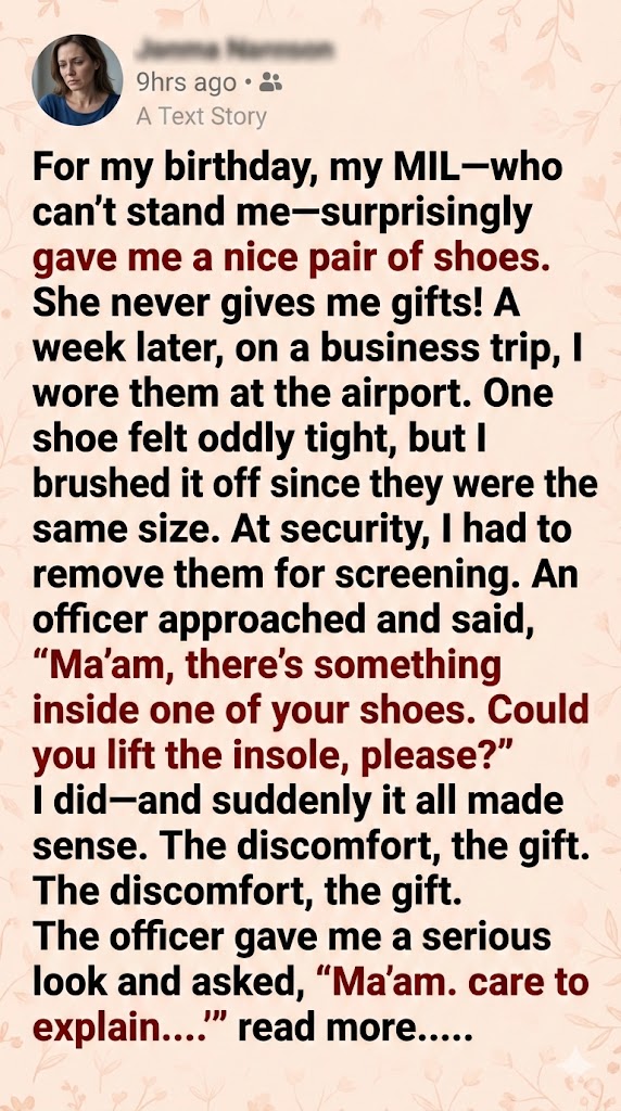 “Well,” she stammered, “I just… I saw on the news they were doing extra checks today. And those shoes… I hoped they were comfortable for the walk through the terminal.”