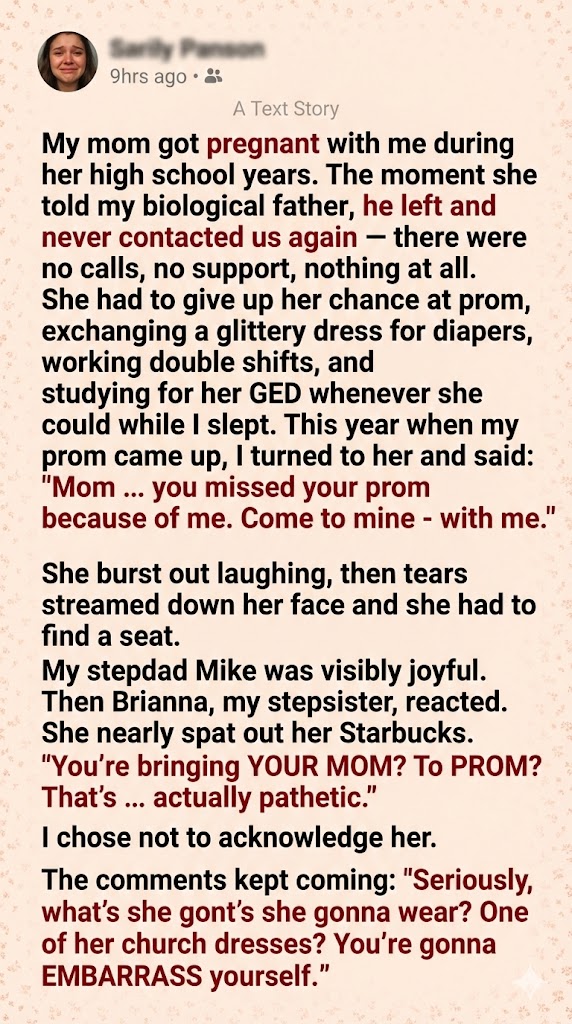 My mom became a parent at 17. She gave up her entire adolescence for me, including the prom she’d dreamed about since middle school. The guy who got her pregnant vanished the second she told him—no goodbye, no support, no curiosity. Mom faced everything alone. College applications went in the trash; her prom dress stayed in the store. She juggled crying kids she babysat, worked graveyard shifts at a truck stop diner, and cracked open GED textbooks after I finally dozed off.