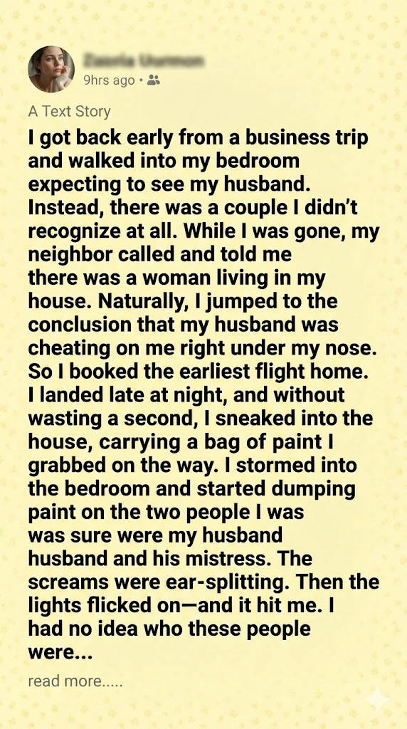 I got back early from a business trip and walked into my bedroom expecting to see my husband. Instead, there was a couple I didn’t recognize at all.