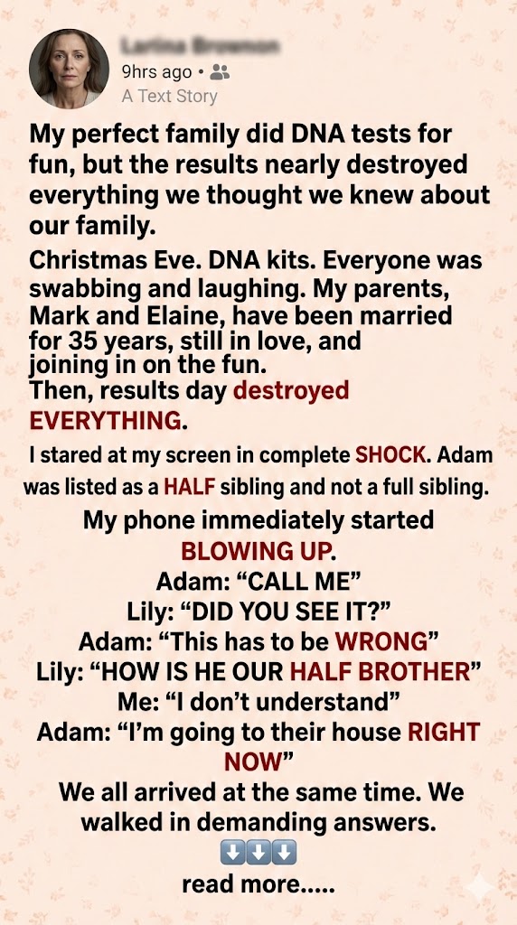 It started as a joke, just a silly and harmless one. My cousin Rachel showed up on Christmas Eve with a grocery bag full of DNA kits. “Early gifts!” she announced, dumping them onto the coffee table. “Everyone gets one!” I laughed, picking up a box. “Rachel, what is this?” “Come on, it’ll be fun! You’ll find out you’re five percent Viking or something.” We were all already a few glasses into the holiday punch. My dad, Mark, looked over and raised an eyebrow. “Is this gonna tell me I’m secretly Italian?” My mom, Elaine, giggled. “After 35 years of marriage, I think I would’ve noticed.”